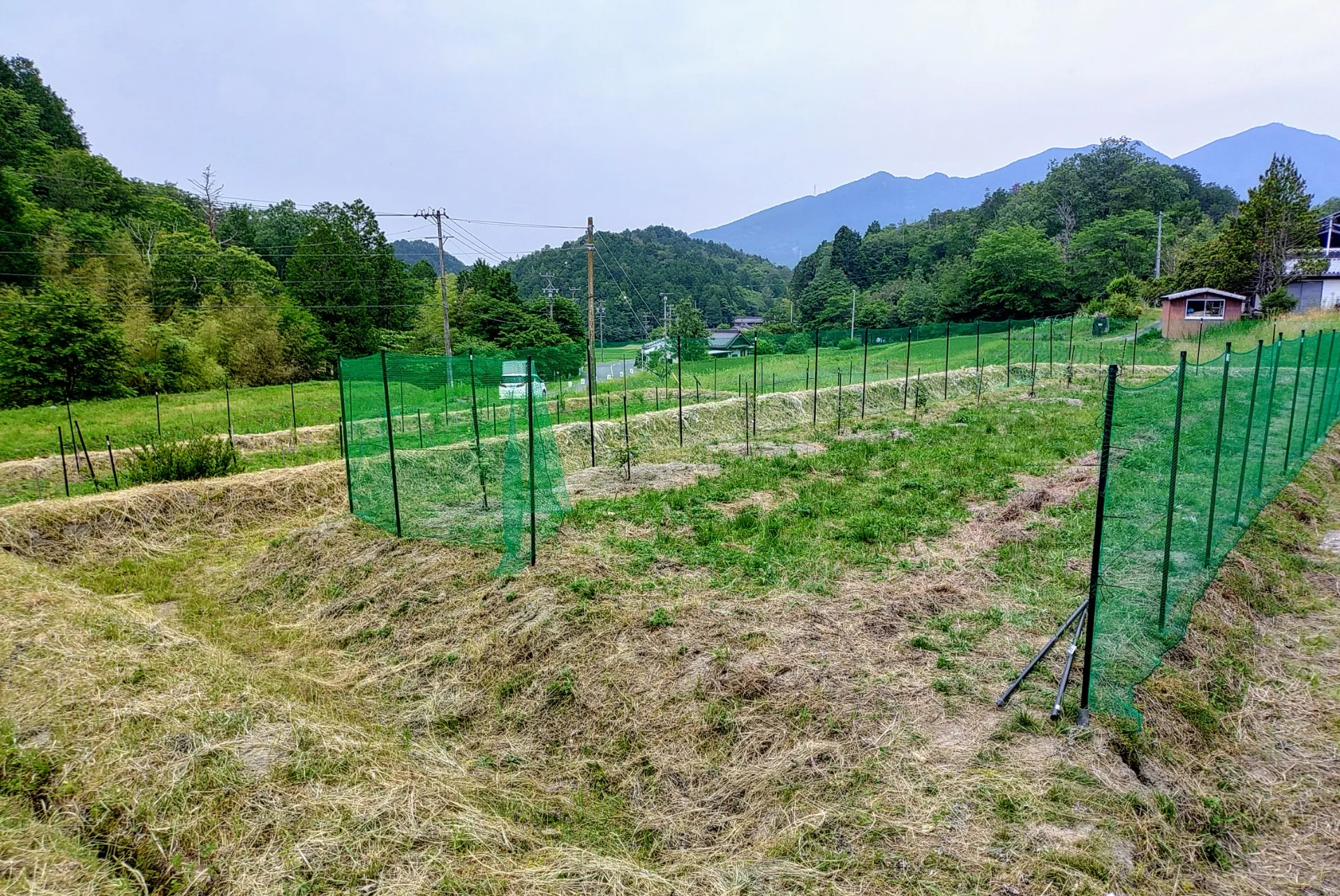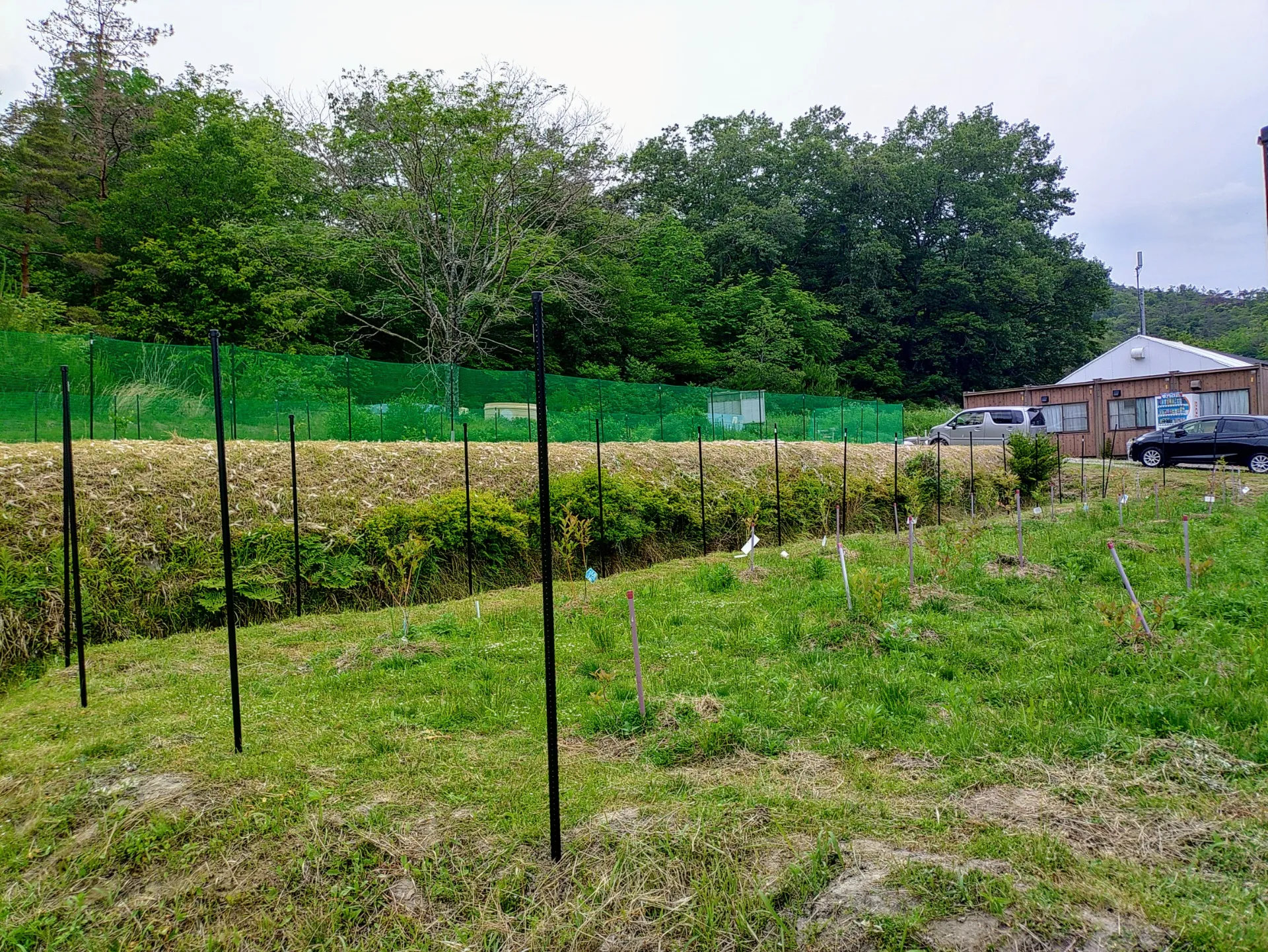 ブルーベリーの実が出てきたら、早速なにものかに食べられてしまいました。カモシカさんがかわいいとか言っている場合ではなくなってきたので、今日は日曜日で利用者さんも少なかったですが、動物防除柵を立て始めてもらいました。まだ完成ではありませんが、良い感じではないでしょうか。